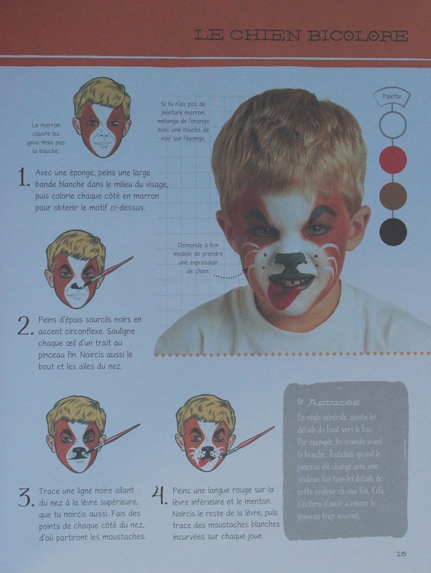 Ce livre fournit toutes les explications nécessaires pour réaliser de nombreux maquillages pour enfants, avec entre autres des modèles d'animaux, de vampires, de monstres... Chaque modèle est accompagné d'explications claires et détaillées, étape par étape, et d'une photo du maquillage terminé. Grâce à de nombreux conseils et astuces, notamment pour bien appliquer et estomper le maquillage, créer des variantes d'un même modèle ou adopter la bonne position, le succès est garanti ! Un guide très complet sur le maquillage pour enfants. Ce grand classique, best-seller des éditions Usborne, a été entièrement revu et dynamisé par de nouvelles illustrations. La couverture cache une reliure à spirale qui permet d'ouvrir le livre bien à plat.