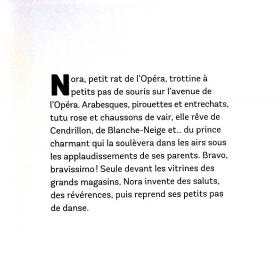 Avec ses ballerines et son tutu roses, Nora est jolie comme un cœur. Il faut la voir trottiner avenue de l'Opéra en fredonnant à tue-tête ! Mais un jour, distraite, elle trébuche sur une plaque d'égoût et la voilà qui bascule dans le vide. Plouf ! Tout au fond, là même où vit une famille de rats peu reluisants, les vilains Rabouille. Raoul, leur petit, gentil, timide et musicien, n'a jamais rien vu d'aussi gracieux que cet ange tombé du ciel ! Nora pleure, elle a peur, mais il lui joue une petite rengaine : Tutu joli tutu turlu tutu... Trois petites notes de musique et ces deux-là se sont trouvés pour la vie.