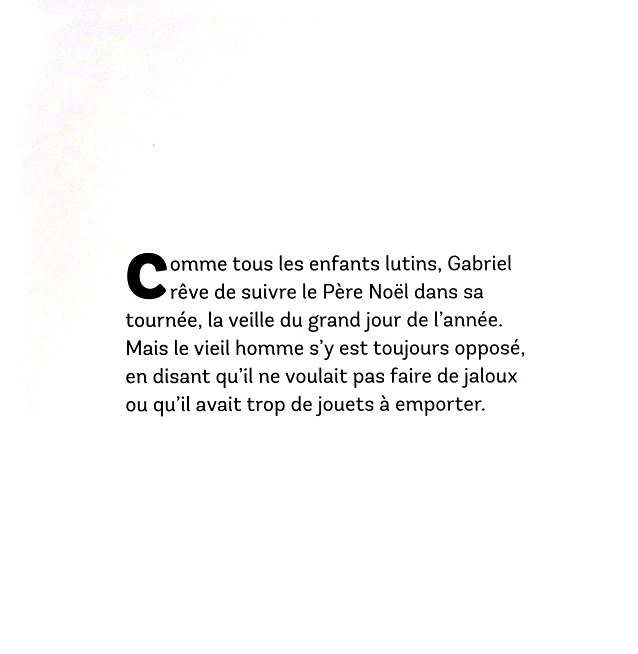 Comme tous les enfants lutins, Gabriel rêve de suivre le Père Noël dans sa tournée. Mais le vieil homme s'y oppose, ne voulant pas faire de jaloux. Gabriel ne l'entend pas ainsi : quand on a un rêve, il faut le réaliser ! Décidé à faire le grand voyage, le lutin prépare son attelage et sa hotte...