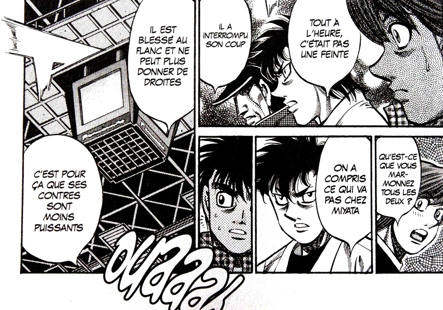 Le combat explosif continue entre les deux adversaires ! Qui de Miyata ou de Randy l’emportera ? Aucun des deux ne veut céder et le suspense est à son comble ! Ippo regarde attentivement le combat et meurt d’envie de reprendre les gants le plus vite possible !
