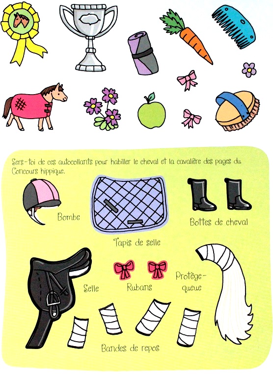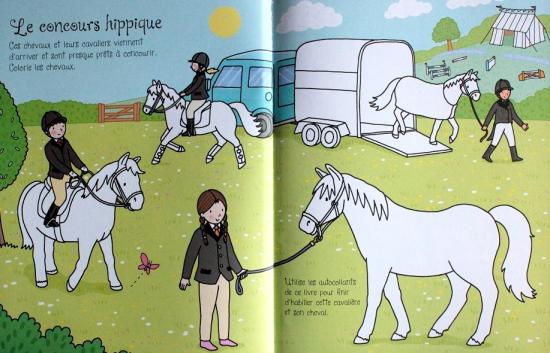 A l’intérieur, les enfants découvriront donc les chevaux et poneys avec les écuyers et leurs tenues plus deux pages d’autocollants pour illustrer les pages au gré de leur imagination !