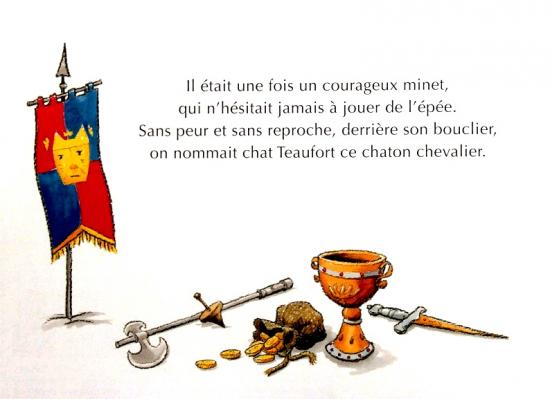 On découvre donc le chat Teaufort qui a une passion pour l’épée et très courageux ! Il parcourt la région sur le dos de son dragon mais un jour ce dernier est capturé par un sorcier ! Ni une ni deux, chat Teaufort se lance à la rescousse de son ami ! Il va rencontrer une jolie princesse qui est aussi à la recherche de son ami et tous deux vont se lancer dans l’aventure avec gaiété et entrain…