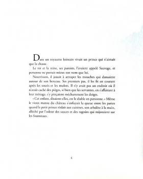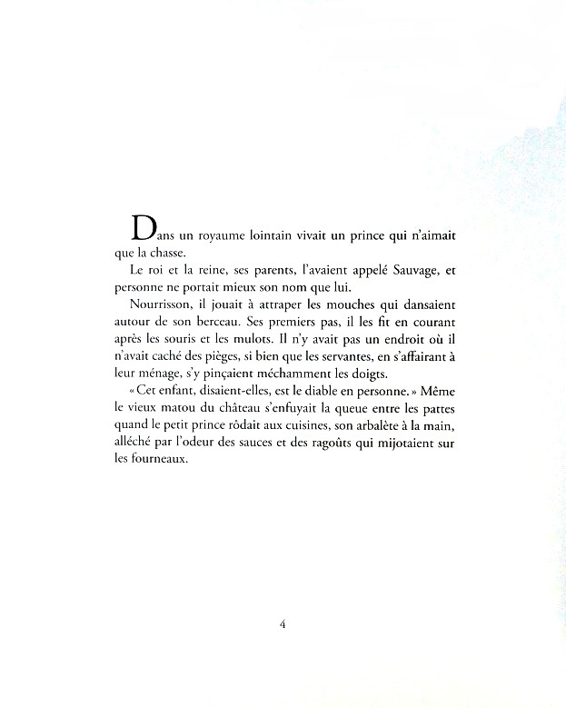Dans un royaume lointain vivait un prince qui n'aimait que la chasse. Le roi et la reine, ses parents, l'avaient prénommé Sauvage. Un jour qu'il traquait un cerf, sa jambe se prit dans un piège qu'il avait lui-même posé à l'automne. Le prince faillit s'évanouir de rage et de douleur. Allait-il mourir ainsi au plus profond de la forêt ? Quand il rouvrit les yeux, une étrange créature le regardait...