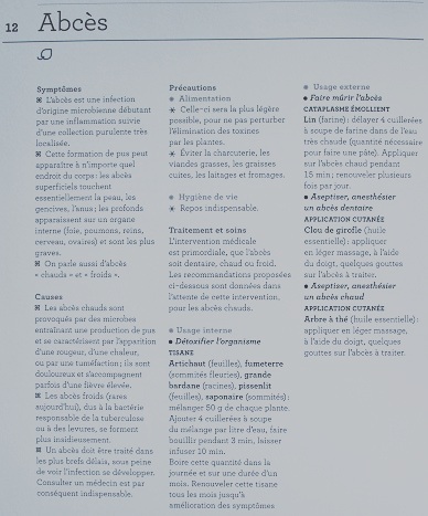 Présenté par ordre alphabétique, chaque maladie comprend deux à quatre pages avec les symptômes, les causes, les traitements et soins, les précautions et préventions, et surtout quelles plantes utiliser à chaque fois, les décoctions, les gélules…